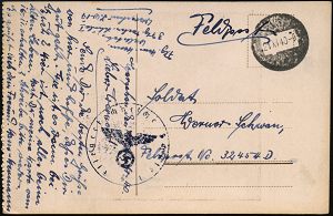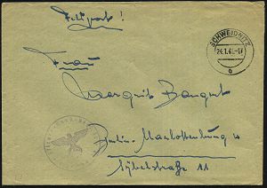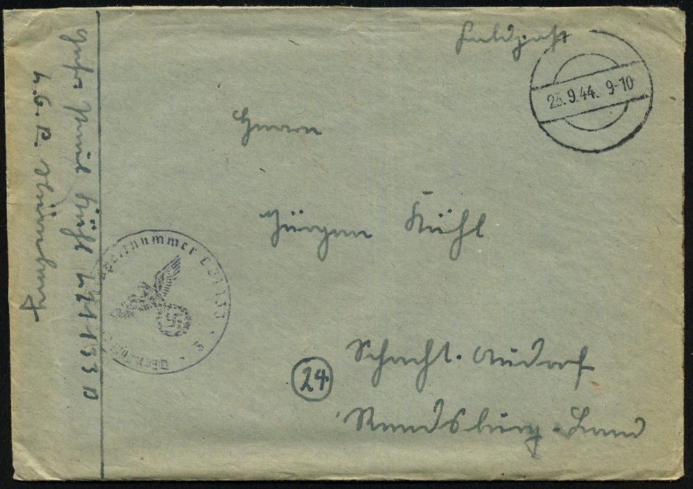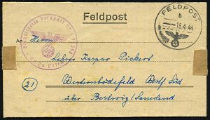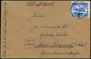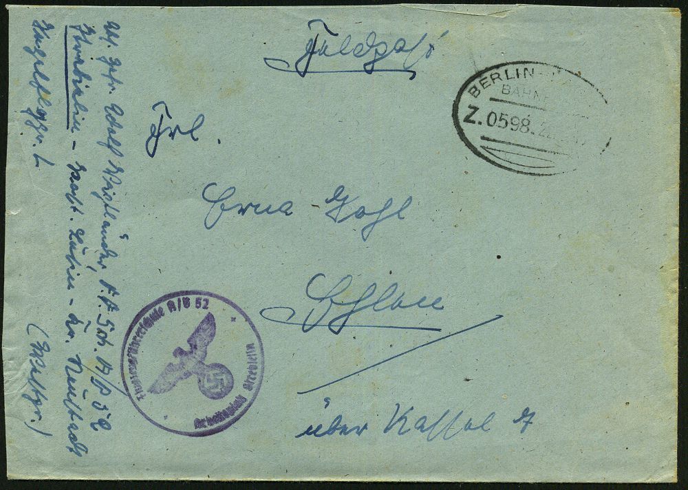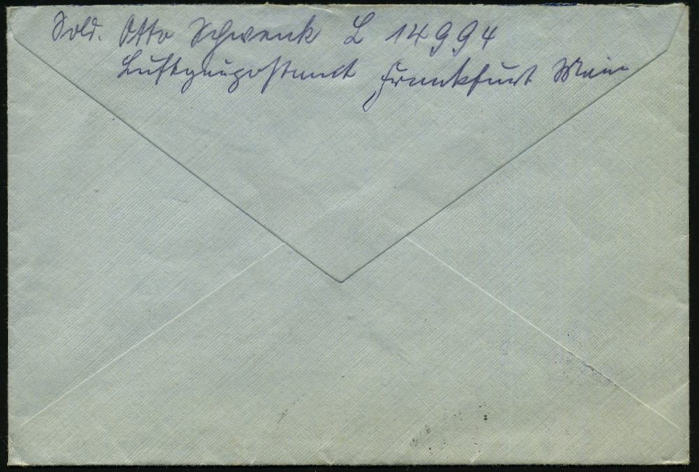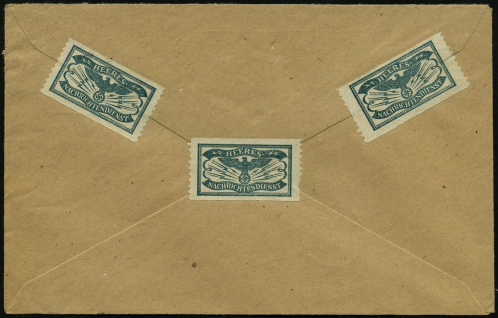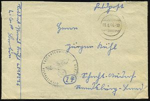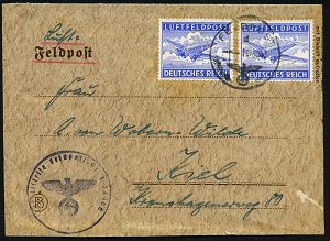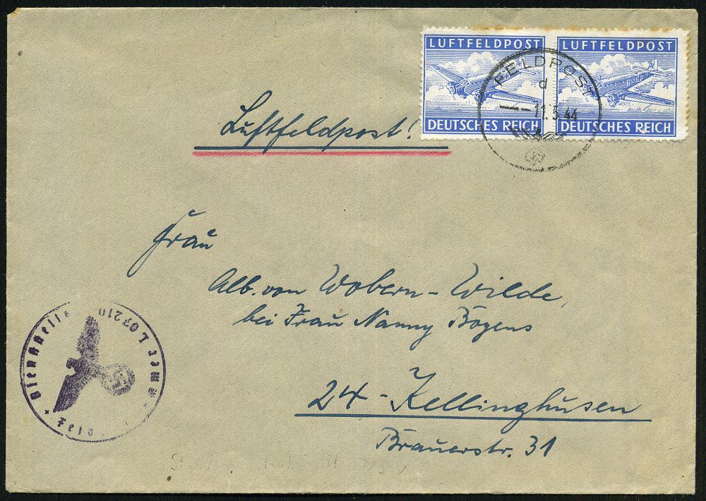 | 2964 | 15 € | II. WELTKRIEG: LUFTWAFFEN-EINHEITEN / LUFTFELDPOST 1939-45 : DEUTSCHES REICH 1944 (5.6.) durchst. Luftfeldpost-Marke, blau, MeF: 2 Stück (Ju 52) + rs. hs. Fp.-Nf.: 00929 = Panzer-Aufklärungs-Abt. 26 , Luft-Feldpost-Bf. n. Berlin (Mi.1 B, MeF) | | |
