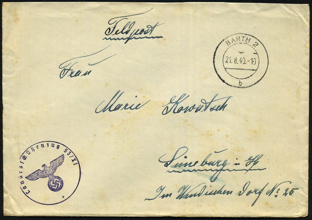 | 2911 | 14 € | II. WELTKRIEG: LUFTWAFFEN-EINHEITEN / LUFTFELDPOST 1939-45 : BARTH 2/ b 1940 (21.8.) 2K-Steg + viol. 1K-HdN: Landesschützenzug 53-XI + rs. hs. Abs.: ".. Kriegsgefangenenlager der Luftwaffe" , Feldpost-Bf. + viel Inhalt ! n. Lüneburg | | |