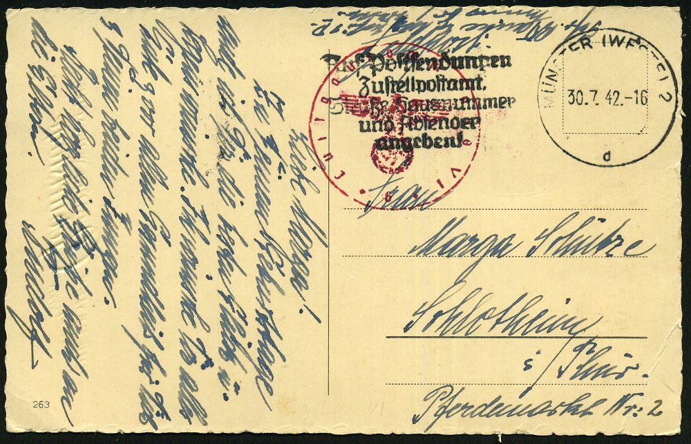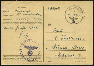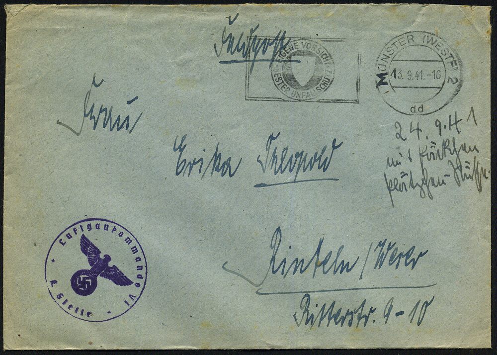 | 2941 | 16 € | II. WELTKRIEG: LUFTWAFFEN-EINHEITEN / LUFTFELDPOST 1939-45 : MÜNSTER (WESTF) 2/ dd/ EIGENE VORSICHT/ BESTER UNFALLSCHUTZ #bzw.# Auf Postsendungen/ Zustell-postamt../ angeben. 1941/42 2 verschiedene MWSt + viol. bzw. roter 1K-HdN: Luftgau-kommando VI/K. Stelle bzw. 6 + je hs. Abs., Feldpost-Bf. + Inhalt bzw. 2 Feldpost-Ktn., 3 Belege (Bo.S 235 A, 268 A) | | |