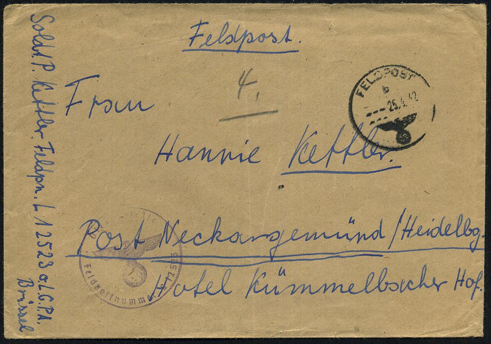 | 2992 | 12 € | II. WELTKRIEG: LUFTWAFFEN-EINHEITEN / LUFTFELDPOST 1939-45 : DT.BES.BELGIEN 1942 (5.3.) 2K-MaSt: FELDPOST/d = Brüssel (ohne Wellen) (Mi.15) + bl. HdN: Fp.Nr.L 01154 = Aufklärungs-Staffel 1 F 22 (links etw. undeutl., rs. Abs. entfernt) Feldpost-Bf. n. Hohnstädt/Grimma | | |