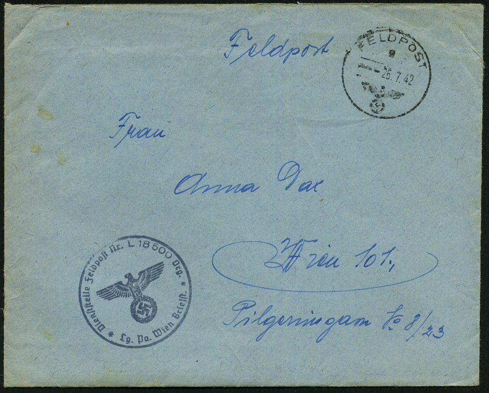 | 2967 | 20 € | II. WELTKRIEG: LUFTWAFFEN-EINHEITEN / LUFTFELDPOST 1939-45 : DEUTSCHES REICH / RUMÄNIEN 1942 (26.7.) 1K: FELDPOST/g/--- + blauer 1K-HdN: Feldpost Nr. L 18 500 Org./Lg. Pa. Wien.. = Deutsche Militär-Mission der Luftwaffe, R u m ä n i e n ! + rs. hs. Abs., klar gest., seltener Feldpost-Bf. + Inhalt n. Wien, vergl. Los Nr. 2968 | | |