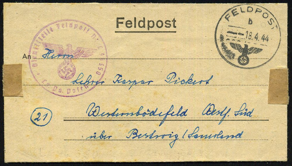 | 2963 | 30 € | II. WELTKRIEG: LUFTWAFFEN-EINHEITEN / LUFTFELDPOST 1939-45 : DEUTSCHES REICH 1941 (ca.) seltener, viol. Päckchen-2L-Aufgabe-Stpl.: Bei der Feldpost/eingeliefert (Michel-Handbuch -.-) + 1K-HdN: Fp.-Nr. L 00747 (links etw.undeutl.) = I. Gruppe Jagd-Geschwader 53, seltener Feldpost-Bf. (gering verkürzt, oben kl.Riß) n. Lübbeke | | |