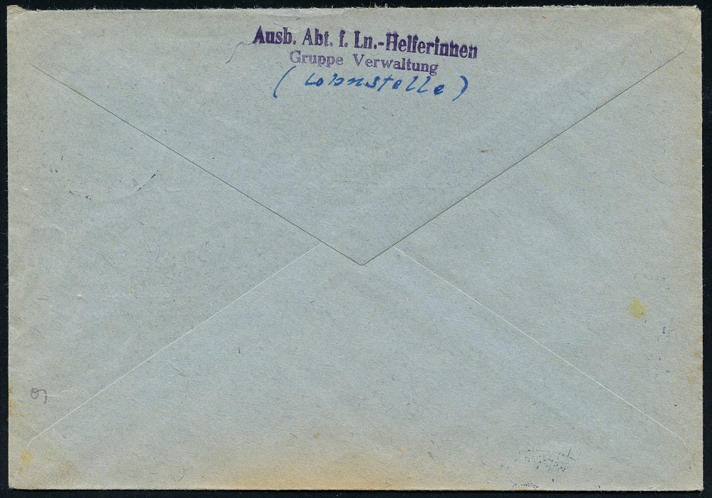 | 2936 | 14 € | II. WELTKRIEG: LUFTWAFFEN-EINHEITEN / LUFTFELDPOST 1939-45 : LANDSBERG (LECH)/ a 1942 (7.9.) 2K-Steg + blauer 1K-HdN: Ausb.(ildungs) Abt. f. Ln. Helf.(erinnen)Landsberg a. L. + rs. Abs.-2L: Ausb. Abt. f. Ln.-Helferinnen.. = weibliche Luftwaffen-Angehörige!, klar gest. Feldpost-Bf. n. Heilbronn | | |