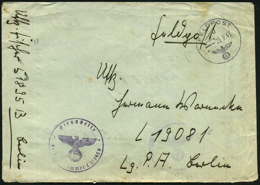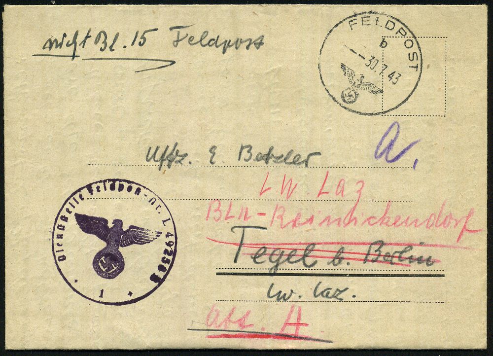 | 2976 | 16 € | II. WELTKRIEG: LUFTWAFFEN-EINHEITEN / LUFTFELDPOST 1939-45 : DEUTSCHES REICH 1943 (Juli/Okt.) 2x 1K: FELDPOST/b/--- + viol. 1K-HdN: Feldpost-Nr. L 49 258 (Lg. Pa. Posen) = Luftwaffen Artl. Rgt. 4, dann Sturmgeschütz Battr. Panzer-Jäger Abt., Lw. Feld-Div. 4 , 2 nachgesandte Feldpost-Falt-Briefe mit Inhalt n. Bln., 2 Belege | | |