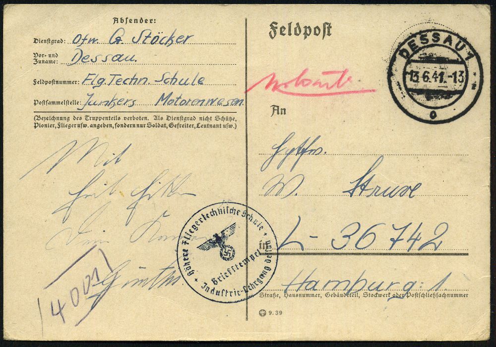 | 2922 | 25 € | II. WELTKRIEG: LUFTWAFFEN-EINHEITEN / LUFTFELDPOST 1939-45 : DESSAU 1/ o 1941 (13.6.) 2K-Steg + blauer 1K-HdN: Höhere Fliegertechnische Schule/Jndustrie-Lehrgang Dessau + hs. Abs.: ".. Flg. Techn. Schule/ J u n k e r s Motorenwesen" , seltene Feldpost-Kt. an Fp.-Nr. L 36 742 = Küsten-Fliegergruppe 906, Einsatz Nordsee gegen brit. Seeverkehr, weitere Belege zum Thema JUNKERS siehe Sektion: LUFTWAFFE | | |