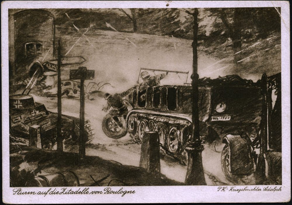 | 2921 | 16 € | II. WELTKRIEG: LUFTWAFFEN-EINHEITEN / LUFTFELDPOST 1939-45 : BUG (RÜGEN)/ c 1942 (6.11.) 2K-Steg + viol. 1K-HdN: Kampfbeobachterschule/8. Schülerkompanie klar gest. Feldpost-Künstler-Propaganda-Ak.: Sturm auf die Zitadelle v. Boulogne (Panzer u. Halbkettenfahrzeuge) von PK Adolph (kl. Eckbug) n.Bln-Charlottenbg. | | |