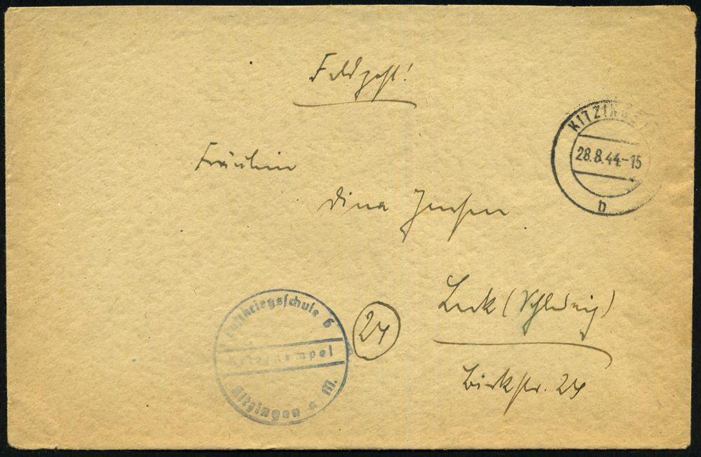 | 2931 | 14 € | II. WELTKRIEG: LUFTWAFFEN-EINHEITEN / LUFTFELDPOST 1939-45 : KITZINGEN 2/ b 1944 (Juli/Aug.) 2x 2K-Steg + viol. Steg-HdN: Luftkriegsschule 6/ Kitzingen a. M. + hs. Abs.: "9. (Kompanie) Luftkriegsschule 6.." , 1x Feldpost-Falt-Bf. mit Inhalt u. 1x Feldpost-Bf. (ohne Inhalt),, 2 Belege | | |
