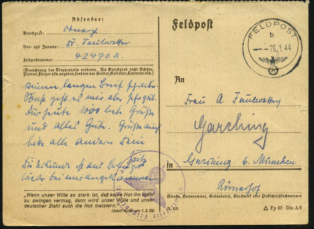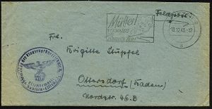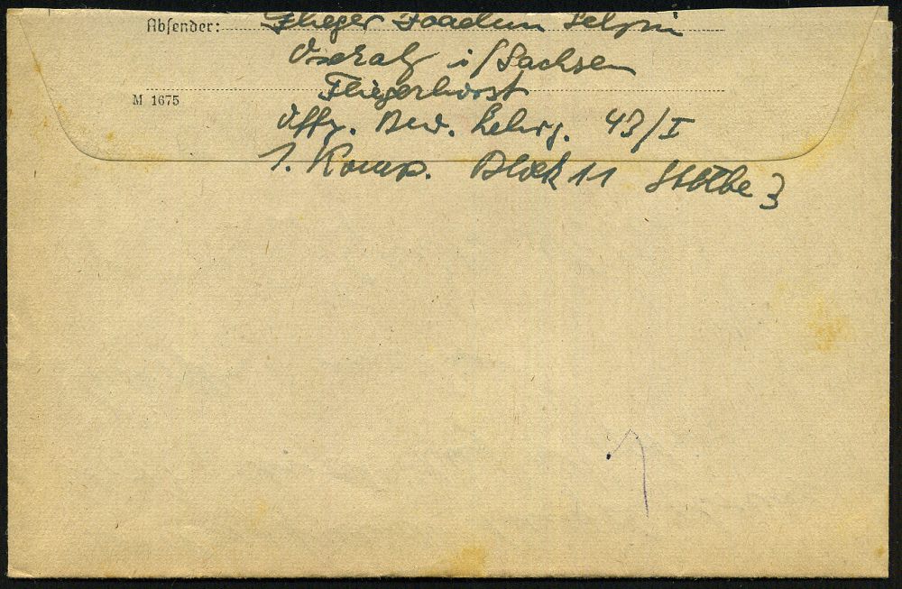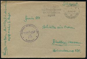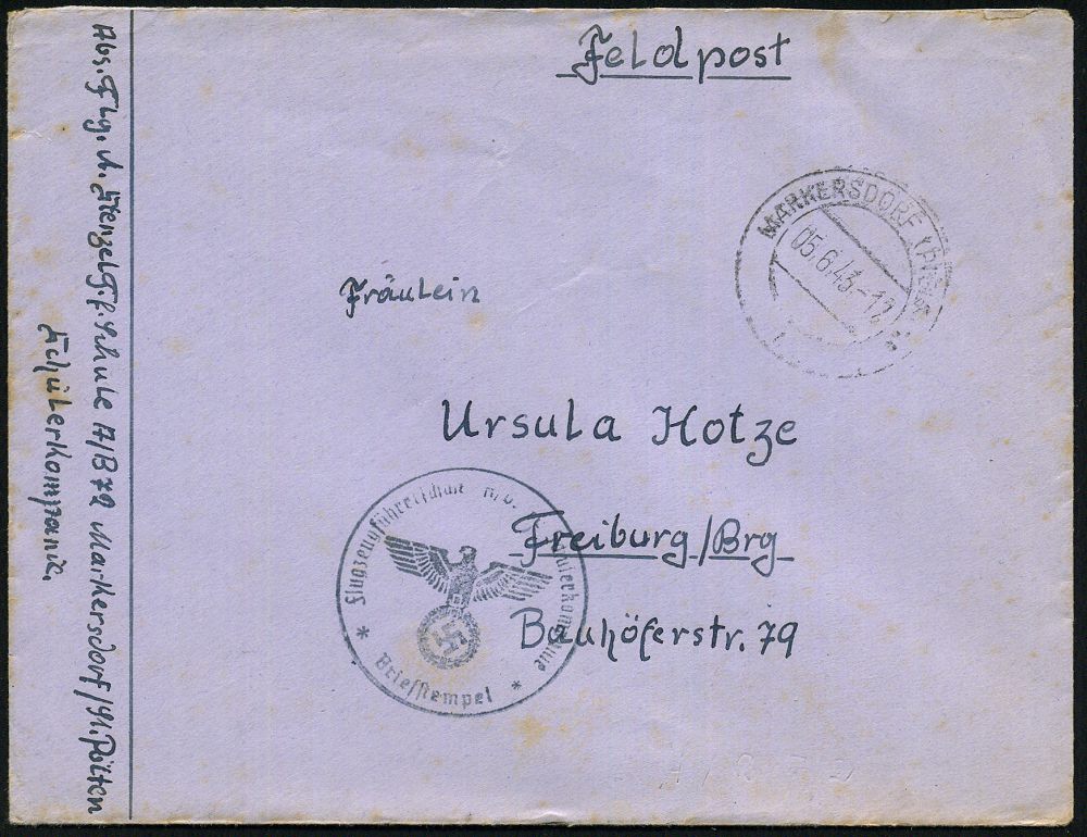 | 2939 | 10 € | II. WELTKRIEG: LUFTWAFFEN-EINHEITEN / LUFTFELDPOST 1939-45 : MARKERSDORF (PIELACH) 1943 (5.6.) 2K-Steg + blauer 1K-HdN: Flugzeugführerschule A/B 72 Schülerkompanie + vs. hs. Abs., Feldpost-Bf. + Inhalt n. Freiburg/Brsg. | | |