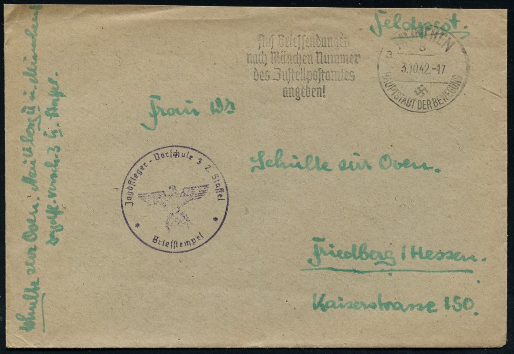 | 2940 | 14 € | II. WELTKRIEG: LUFTWAFFEN-EINHEITEN / LUFTFELDPOST 1939-45 : München 1942 (3.10.) Serien-MWSt.: MÜNCHEN/8/a/HDB/Auf Briefsendungen/nach München.. (Bo.S 363 A) + viol. 1K-HdN: Jagdflieger-Vorschule 3, 2. Staffel + hs. Abs., Feldpost-Bf. n. Friedberg/Hess. | | |