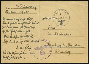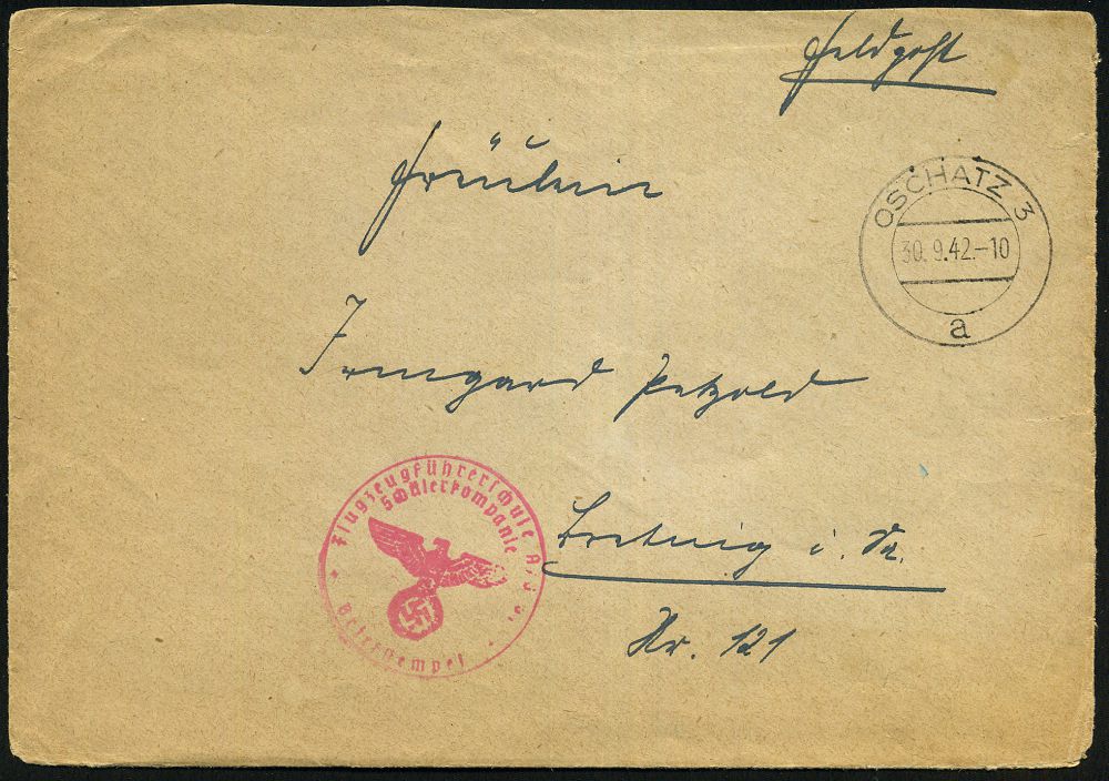 | 2935 | 30 € | II. WELTKRIEG: LUFTWAFFEN-EINHEITEN / LUFTFELDPOST 1939-45 : Lager Lechfeld 1942 (2.12.) stummer Band-MaSt. = Tarnstempel Augsburg (7 Striche) + viol. 1K-HdN: Fp. Nr. L 36 955 = Fall-schirm-Jäger Rgt. 2 + hs. Abs.: "Nachtjagdschule 1 Lagerlechfeld..", Feldpost-Bf. (oben 2x Riß) + viel Inhalt! n. Berlin | | |