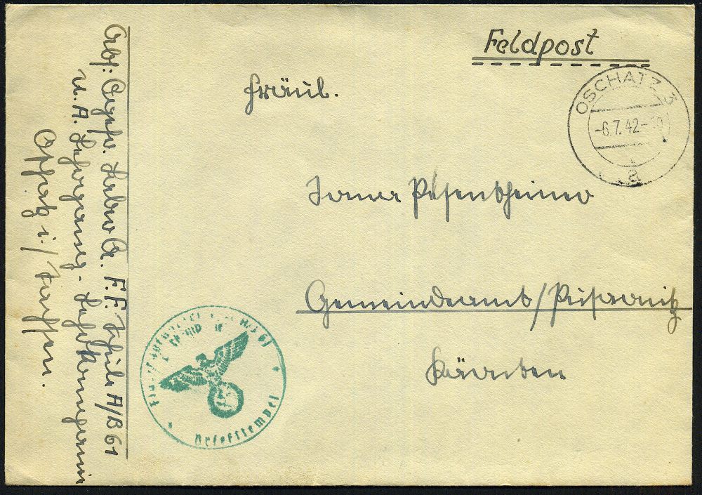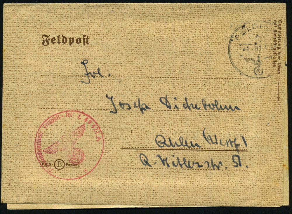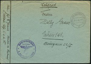 | 2928 | 15 € | II. WELTKRIEG: LUFTWAFFEN-EINHEITEN / LUFTFELDPOST 1939-45 : Wien-Seyring 1942 (12.V.) weiterverwendeter österr Bahn-2K: GRUSBACH - WIEN/R/24 + viol. Ra.: Flieger-Ausbildungs-regiment 71 , rs. roter Setzkasten-Absender-4L: Waffen-Uffz... Stab II Flg. Ausb. Regt. 71/ WIEN-SEYRING/ Waffenmeisterei, klar gest. Feldpost-Bf. (oben 1x Riß) + viel Inhalt n. Diez | | |