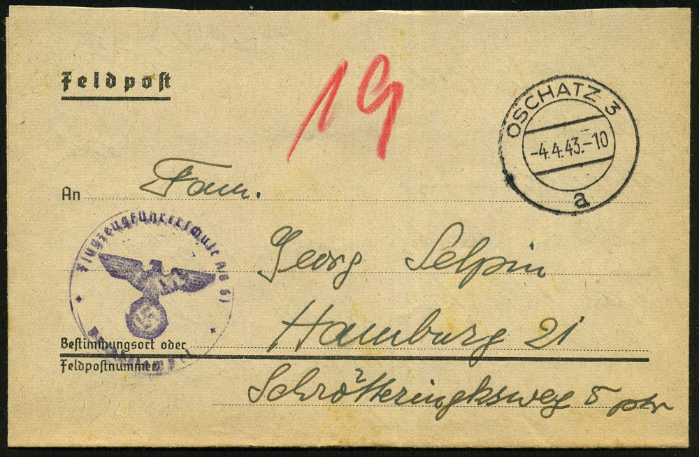 | 2945 | 18 € | II. WELTKRIEG: LUFTWAFFEN-EINHEITEN / LUFTFELDPOST 1939-45 : OSCHATZ 3/ a 1942/43 4x 2K-Steg + roter 1K-HdN: Flugzeugführerschule A/B 61/Schülerkompanie bzw. grüner 1K-HdN: Flug-zeugführerschule A/B 61 bzw. viol. 1K-HdN: Flugzeugführerschule A/B 61 + hs. Abs., dabei: "..U.A. Lehrgang" bzw. "..Flieger-horst, Offz. Bew. Lehrg. 43-I.." etc., 3 Feldpost-Briefe (1x unsichtbarer Riß) 2x mit Inhalt, 3 Belege | | |