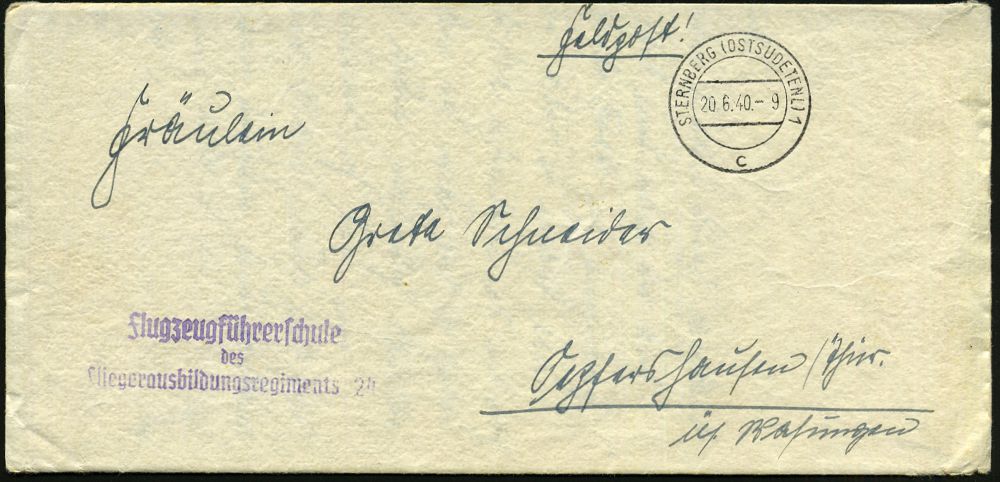 | 2950 | 16 € | II. WELTKRIEG: LUFTWAFFEN-EINHEITEN / LUFTFELDPOST 1939-45 : STERNBERG (OSTSUDETENLAND) 1/ c 1940 (20.6.) 2K-Steg + viol. 3L: Flugzeugführerschule/des/ Fliegerausbildungsregiments 24 + rs. hs. Abs., Feldpost-Bf. + Inhalt, 2 Belege kompl.! | | |