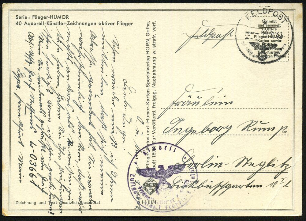 | 2965 | 16 € | II. WELTKRIEG: LUFTWAFFEN-EINHEITEN / LUFTFELDPOST 1939-45 : DEUTSCHES REICH 1942 (März/Apr.) 1K: FELDPOST/b/--- bzw. FELDPOST/e/--- + viol. 1K-HdN: Einheit/Feldpostnr. L 03661 Lgpa Frankfurt (Main) bzw. Dienststelle Feldpostnr. L 03661/Lgpa. Frankfurt-Main = Zerstörer-Schule 2 , Feldpost-Künstler-Color-Humor-Ak. "Rückkehr vom 1. Überlandflug" (Eckbugspur) u. Feldpost-Bf. + Inhalt, 2 Belege | | |