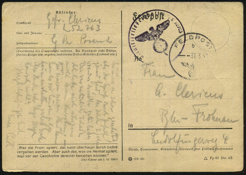| 2974 | 15 € | II. WELTKRIEG: LUFTWAFFEN-EINHEITEN / LUFTFELDPOST 1939-45 : Breslau 1943 (20.6.) 1K: FELDPOST/e/--- + schw.-viol.1K-Hdn: Fp.-Nr. L 31561 = J a g d - Geschwader 52 + rs. hs. Abs.: "..L - 31561, Lg. P. A. Breslau", kleiner Feldpost-Bf. + Inhalt n. Weiden/Opf. | | |