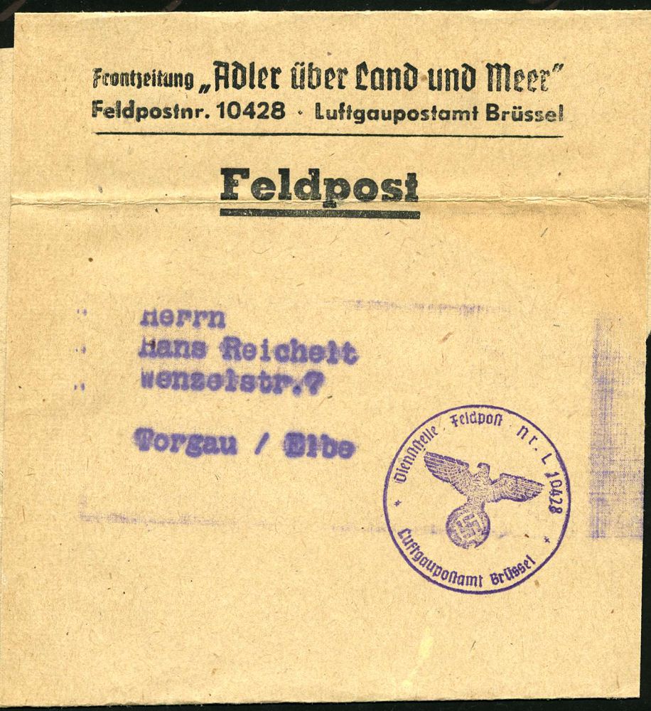 | 2994 | 30 € | II. WELTKRIEG: LUFTWAFFEN-EINHEITEN / LUFTFELDPOST 1939-45 : DT.BES.BELGIEN 1941 (ca.) Feldpost-Zeitungs-Streifband: Frontzeitung "Adler über Land u.Meer" Fp.-Nr. 10 428 LGPA Brüssel + entspr. viol. 1K-HdN = Luftwaffen-Zeitung n. Torgau, selten! (Mi.4, 75.- EUR, 2009) | | |