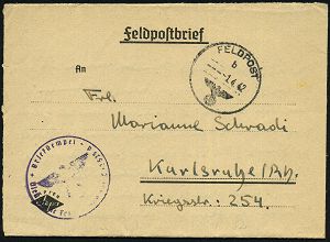 | 2958 | 15 € | II. WELTKRIEG: LUFTWAFFEN-EINHEITEN / LUFTFELDPOST 1939-45 : WIENER NEUSTADT 1/ 4a 1940 (27.8.) ehem., österr. 1K-Brücke + viol. 1K-HdN.: 2. (Schüler)-Komp. Flugzeugführerschule L 8 Wr.-Neustadt , rs. hs. Abs., klar gest. Felpost-Bf. + Inhalt n. Hamburg | | |