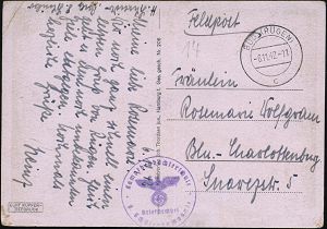 | 2990 | 14 € | II. WELTKRIEG: LUFTWAFFEN-EINHEITEN / LUFTFELDPOST 1939-45 : GENERALGOUVERNEMENT 1941 (17.4.) stumme 1K-Brücke = Tarnstempel (Lublin ?) + roter 1K-HdN: 3./ Flieger-Ausbildungs Rgt. 21 + hs. Abs.: ".. Ausb. Rgt. 21, Lubartow.." , Feldpost-Kt. n. Bonn | | |