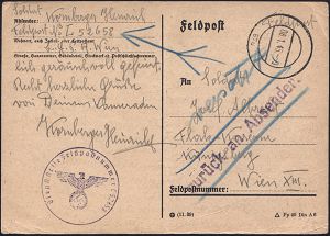 | 2985 | 16 € | II. WELTKRIEG: LUFTWAFFEN-EINHEITEN / LUFTFELDPOST 1939-45 : DEUTSCHES REICH 1945 (8.1.) stummer 2K-Steg mIT Ziffer 570 (unten im Kreis) = Tarnstempel Wien?, viol. 1K-HdN: Fp. Nr. L 52 658 = schwere Flak-Abt. 372 + viol. 1L: zurück an Absender + hs. "versetzt", klar gest. späte Retour-Feldpost-Kt. (Mittelbugspur) an Flakkaserne Wien | | |
