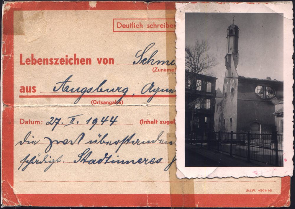 | 3005 | 25 € | LUFT- & BOMBENKRIEG / KINDER-EVAKUIERUNG (KLV) / FLAK-EINHEITEN (1939-45) : Augsburg 1944 (27.2.) rote Lebenszeichen-Kt., Druckvermerk Std.W. 4304 43 (starke Mäng., geklebt u. hinterlegt) + orig. Foto der zerstörten Kirche "St. Ursula", 2 interss. Dokumente des Luftkrieges!, sehr seltene Kombination! (ex Slg. Heimann) | | |