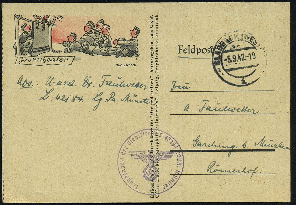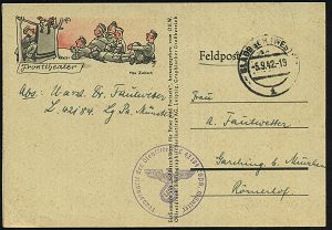 | 3018 | 16 € | LUFT- & BOMBENKRIEG / KINDER-EVAKUIERUNG (KLV) / FLAK-EINHEITEN (1939-45) : GLADBECK (WESTF)/ 2/ i 1942 (5.9.) 2K-Steg + viol. 1K-HdN: Truppenarzt der Dienststelle L 42 184 LGPA. Münster = Stab L u f t s p e r r - Abt. 103 , klar gest. Feldpost-Künstler-Ak.: Fronttheater (Kasperle-Theater) sign. Max Zschoch n. Garching | | |