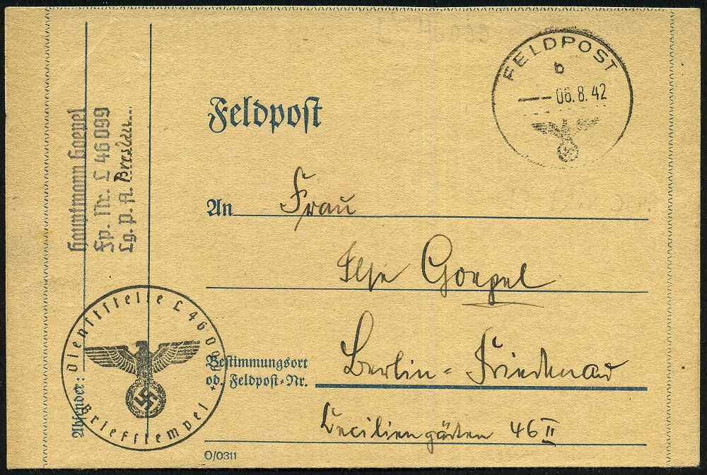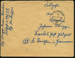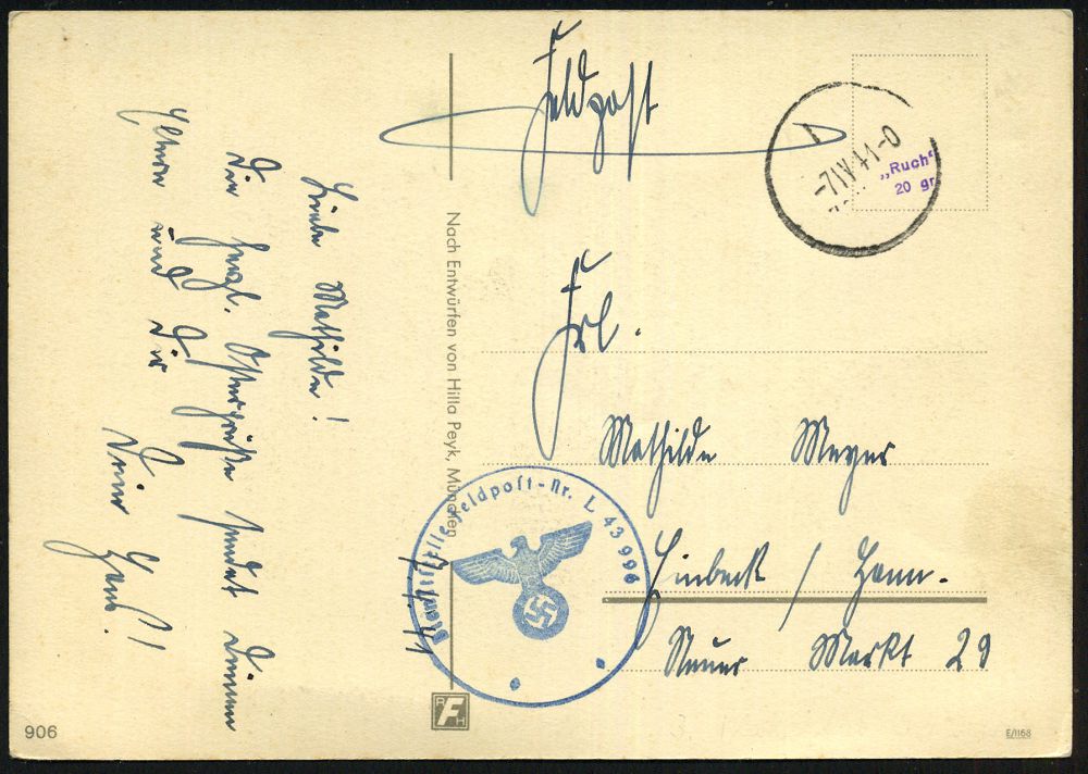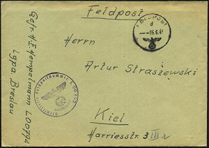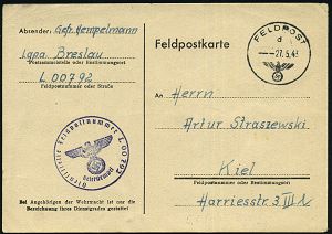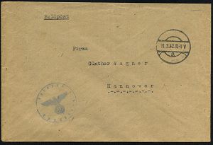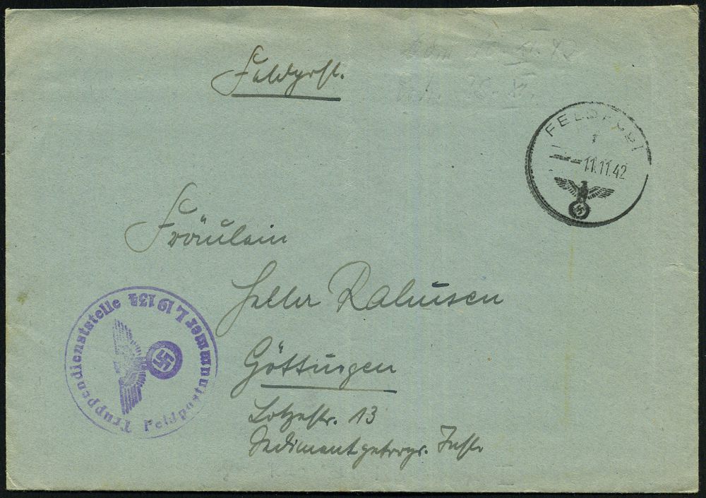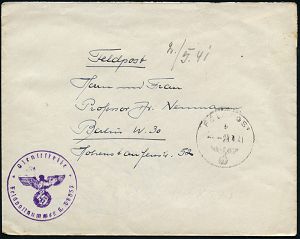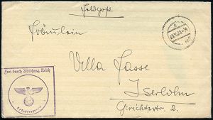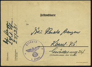 | 3038 | 10 € | LUFT- & BOMBENKRIEG / KINDER-EVAKUIERUNG (KLV) / FLAK-EINHEITEN (1939-45) : DEUTSCHES REICH 1941 (17.11.) stummer 2K-Steg = Tarnstempel (Hannover ?) + viol. 1K-HdN: Feldpost-Nr. L 42 630/ Luftgaupostamt Münster = 5. Battr. Res.-Flak Abt. 113 + rs. hs. Fp.-Nr., klar gest. Feldpost-Bf. + Inhalt n. Leipzig | | |