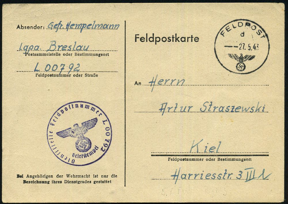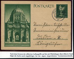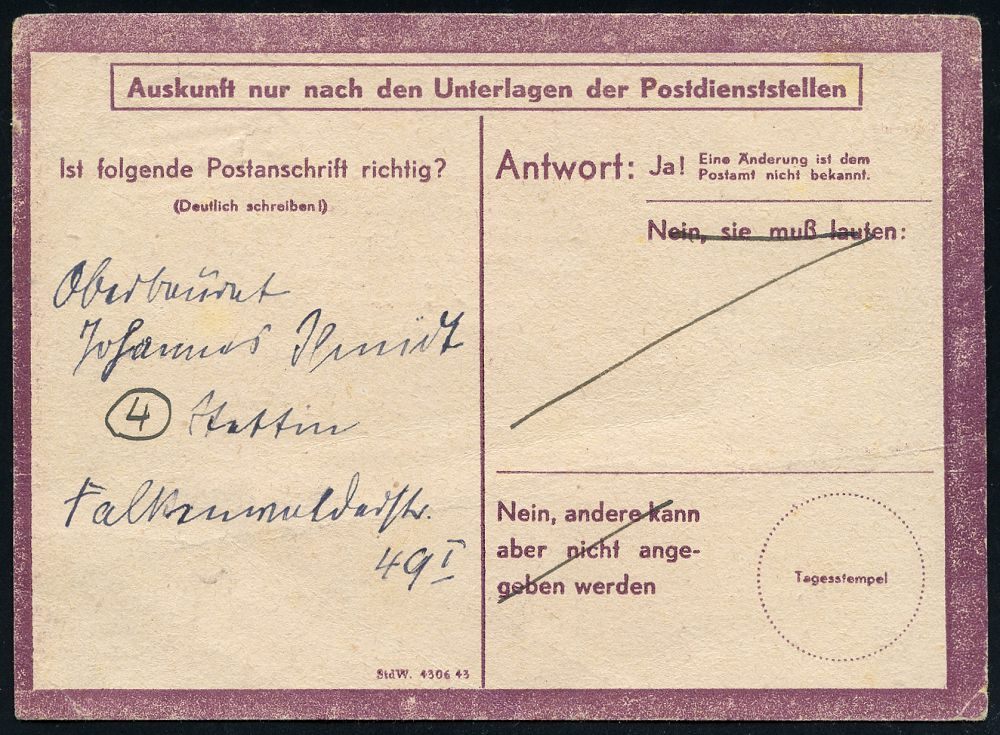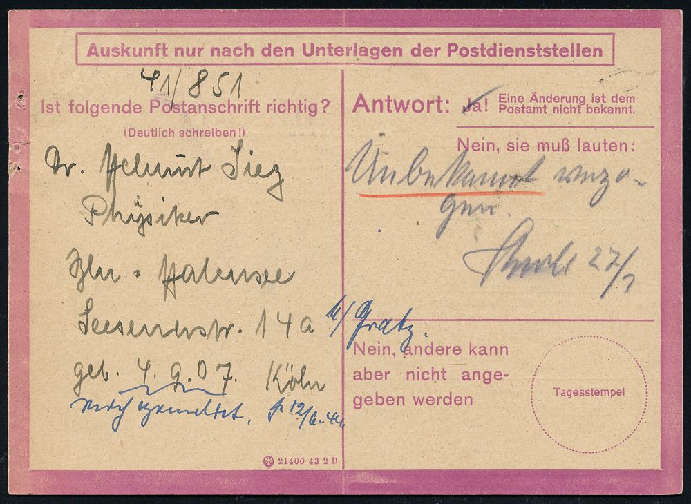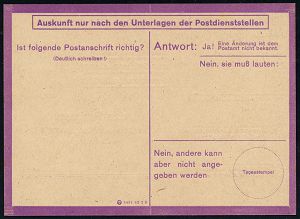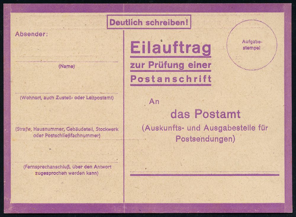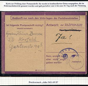 | 3042 | 15 € | LUFT- & BOMBENKRIEG / KINDER-EVAKUIERUNG (KLV) / FLAK-EINHEITEN (1939-45) : DEUTSCHES REICH 1943 viol. "Eilantrag zu Prüfung einer Postanschrift" mit Druckvermerk: 5431 43 2 D (ME.Nr.1) ungebr., die Karte war vom 4. bis 10. Tag nach Bombenangriffen portofrei, wenn der Ort im Wehrmachtsbericht genannt wurde | | |