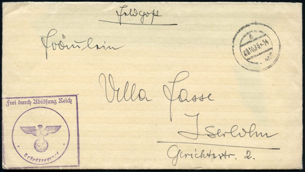 | 3015 | 14 € | LUFT- & BOMBENKRIEG / KINDER-EVAKUIERUNG (KLV) / FLAK-EINHEITEN (1939-45) : Düsseldorf 1939 (26.10.) stummer 2K-Steg = Tarnstempel (Düsseldorf ?) + aptierter HdN: Frei durch Ablösung Reich/Briefstempel = Einheit entfernt! , rs. hs. Fp.-Nr. 06048 = 3./ Res. Flak-Abt. 141, Feldpost-Bf. + viel Inhalt (2 Briefbogen) n. Iserlohn, "Sitzkrieg"-Periode! | | |