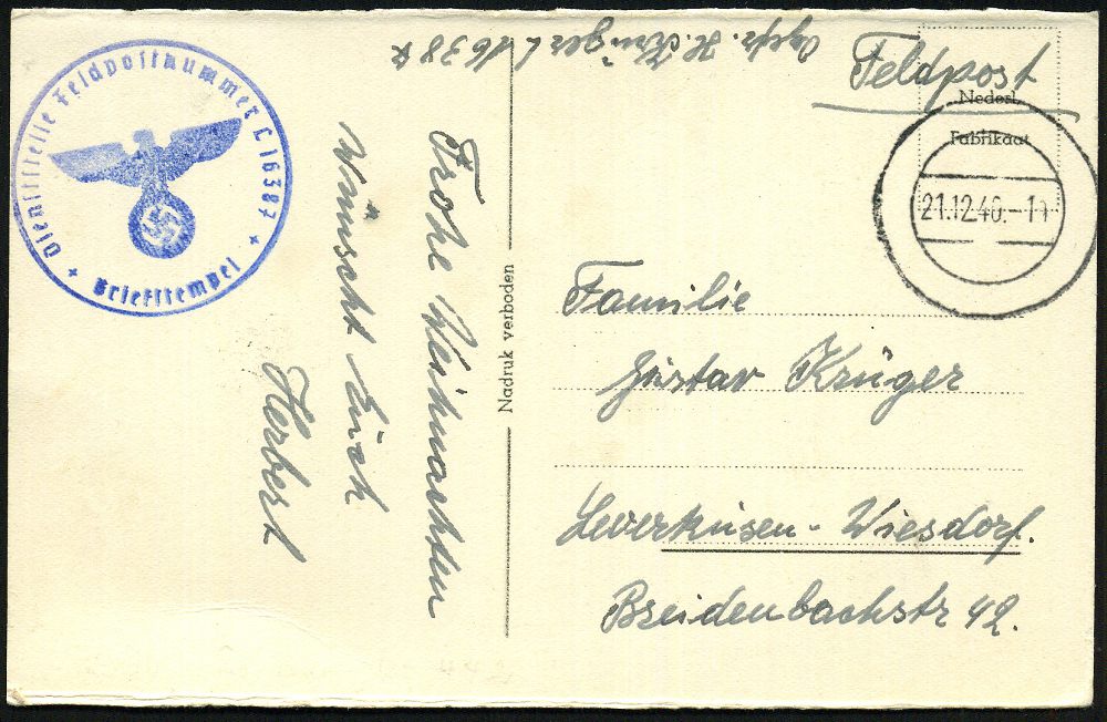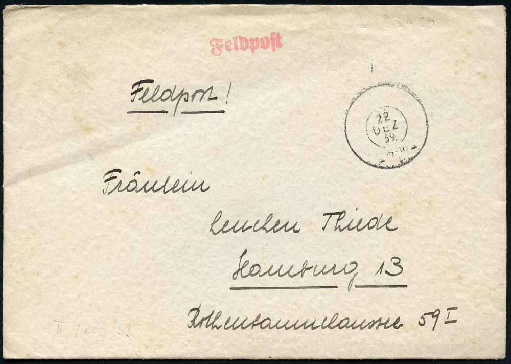 | 3034 | 14 € | LUFT- & BOMBENKRIEG / KINDER-EVAKUIERUNG (KLV) / FLAK-EINHEITEN (1939-45) : DEUTSCHES REICH 1939 (22.12.) stummer, baayer. 2K = Tarnstempel + rs. hs. Abs.: Feldpost-Nr. L 06460 = Kampf-Geschwader 53 , Feldpost-Bf. + Inhalt n. Hambg. | | |
