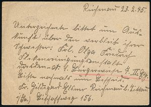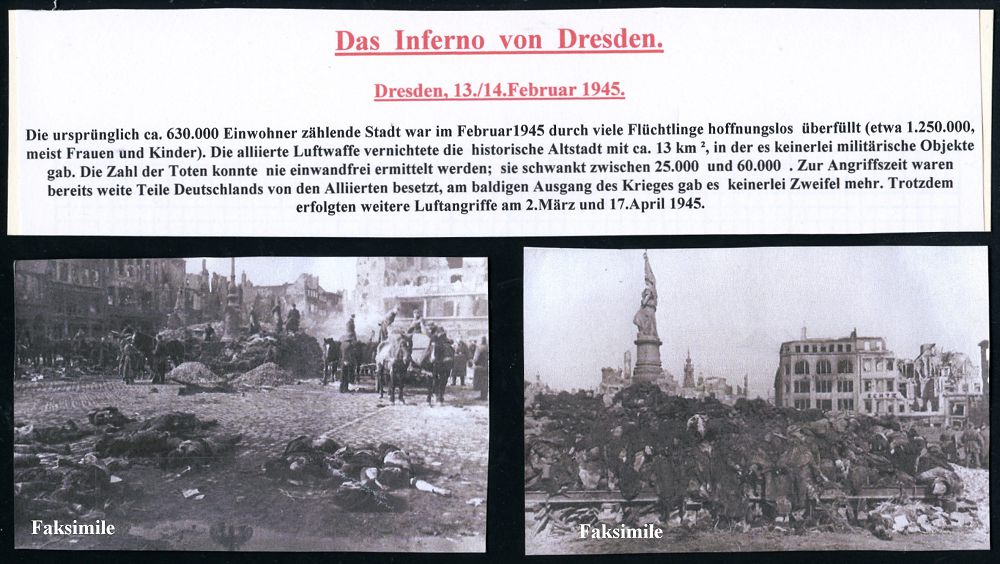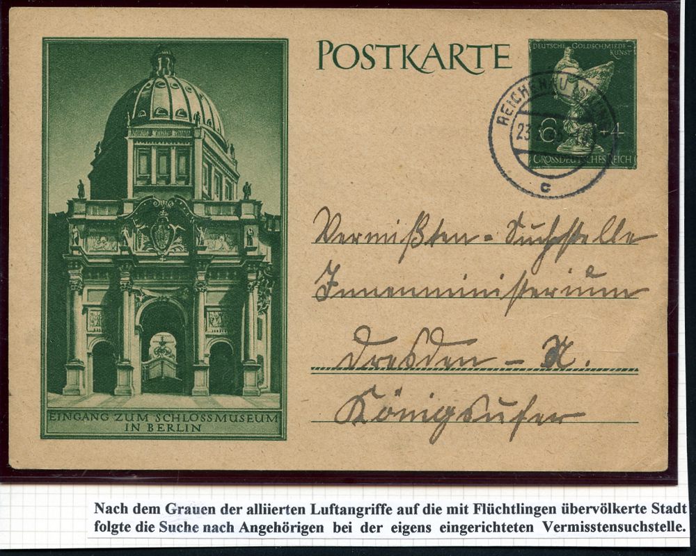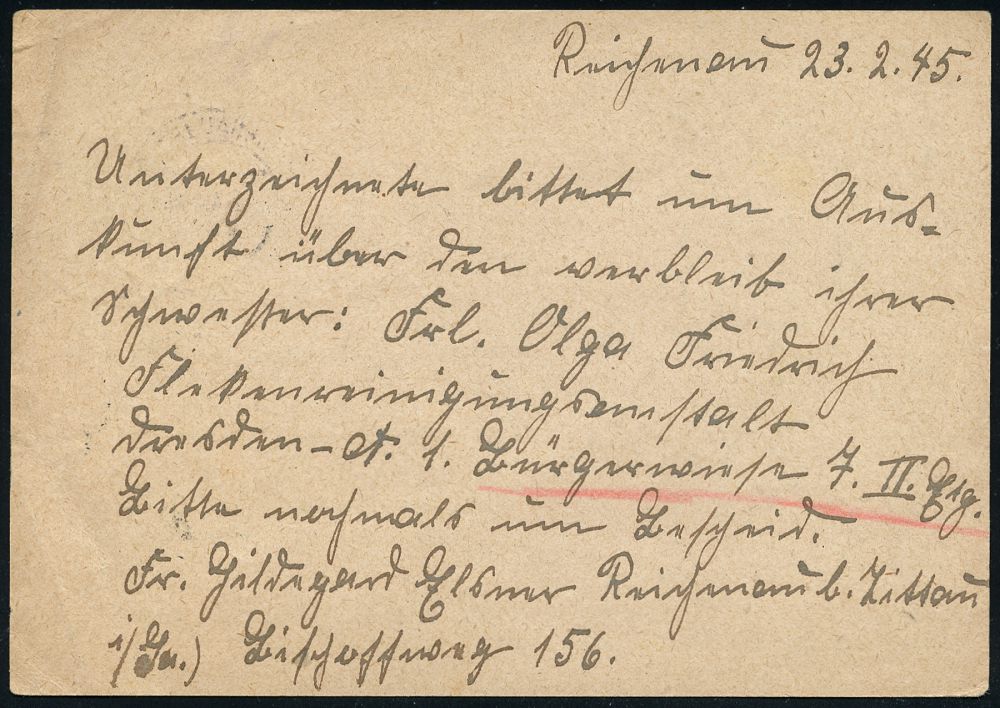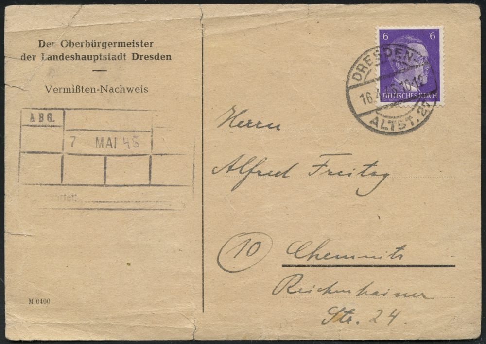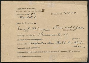 | 3013 | 35 € | LUFT- & BOMBENKRIEG / KINDER-EVAKUIERUNG (KLV) / FLAK-EINHEITEN (1939-45) : Dresden 1945 (16.4.) Dienst-Karte: Der Oberbürgermeister des Landeshauptstadt Dresden, Vermißten-Nachweis (Randmäng.) mit Vordruck: "..von der Krimminalpolizei als tot gemeldet.." (gestrichen) u. neue Anschrift n. Chemnitz, bezieht sich auf die verheerenden Angriffe auf Dresen! | | |