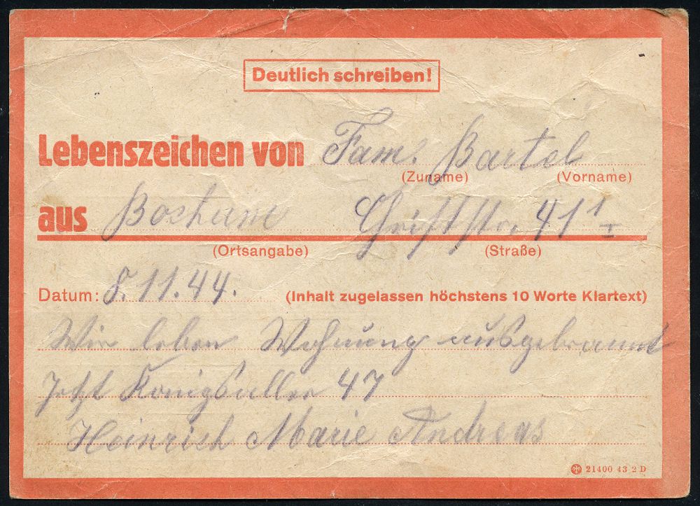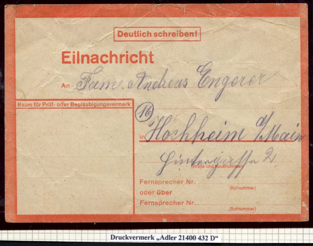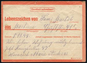 | 3009 | 30 € | LUFT- & BOMBENKRIEG / KINDER-EVAKUIERUNG (KLV) / FLAK-EINHEITEN (1939-45) : Bochum 1944 (8.11.) rote Eil-Nachrichtenkarte mit Druckvermerk: 21400 432 D (Beförd.-Spuren) n. Hochheim/Main = Angriff von 176 RAF-Bombern auf Bochum am 4./5.11 (ME-Nr.2) | | |