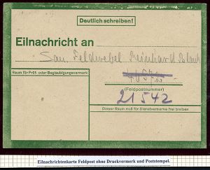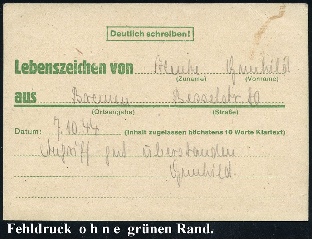 | 3010 | 35 € | LUFT- & BOMBENKRIEG / KINDER-EVAKUIERUNG (KLV) / FLAK-EINHEITEN (1939-45) : Bremen 1944 (7.10.) grüne Eil-Nachrichten-Kt. o h n e Druckvermerk und o h n e grünen Rand rs. = Fehldruck (ME.Nr,F 2) in guter Erhaltung an Feldpost-Nr. 21 542 (= Pio. Regts-Stab 627), seltener Beleg! | | |