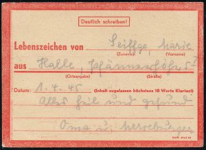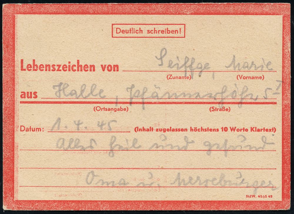 | 3019 | 30 € | LUFT- & BOMBENKRIEG / KINDER-EVAKUIERUNG (KLV) / FLAK-EINHEITEN (1939-45) : Halle/ S. 1945 (1.4.) rote Eil-Nachrichten-Kt. mit Druckdatum: StdW 4304 43 (ME.Nr.3) in sehr guter Erhaltung n. Söllinchau | | |