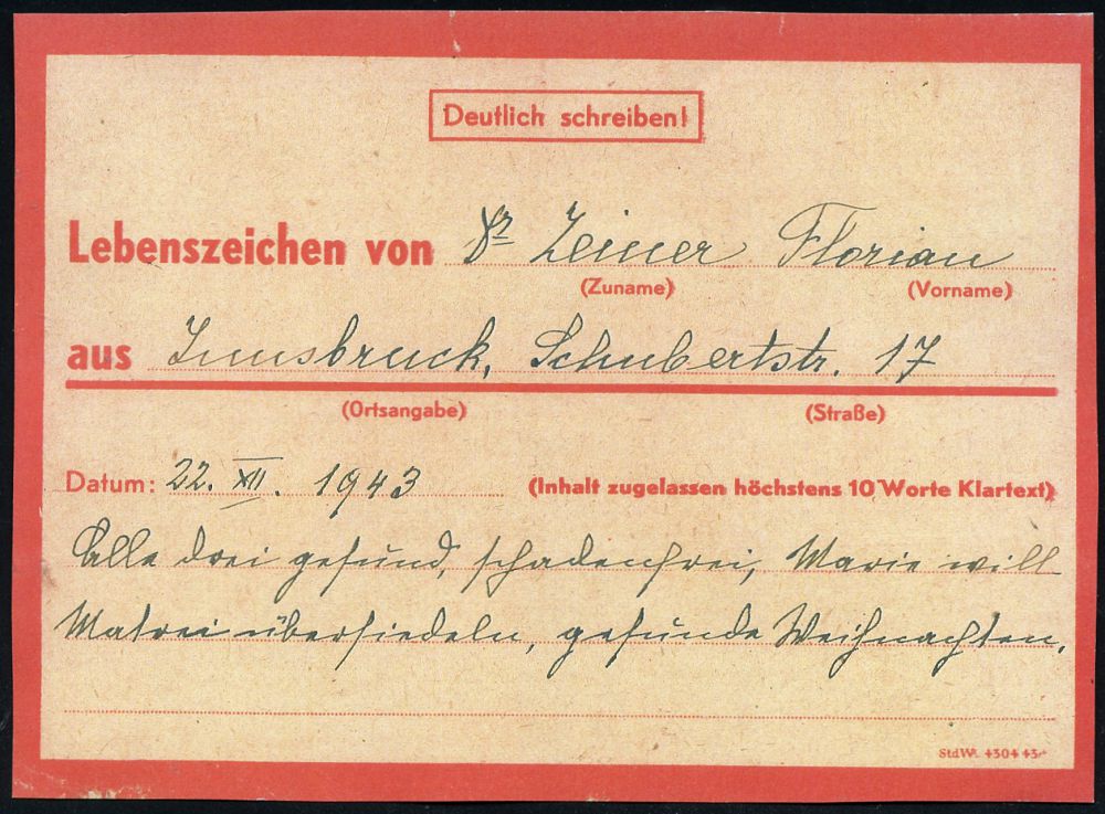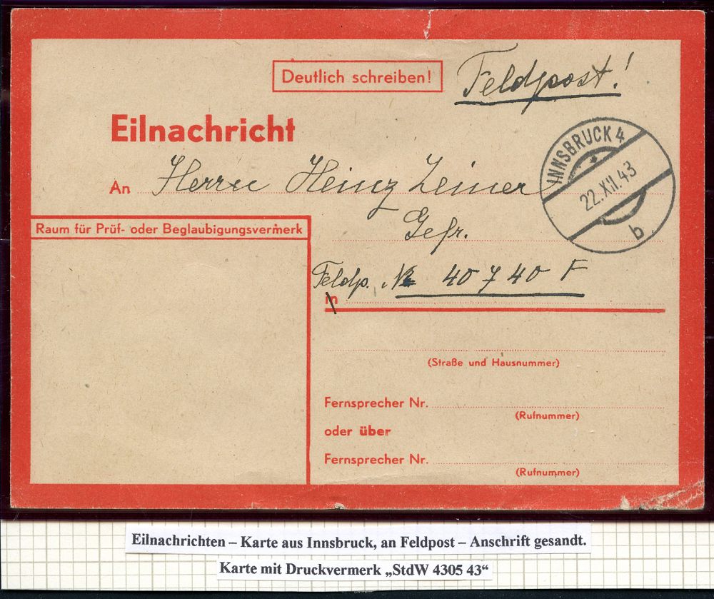 | 3020 | 30 € | LUFT- & BOMBENKRIEG / KINDER-EVAKUIERUNG (KLV) / FLAK-EINHEITEN (1939-45) : INNSBRUCK 4/ b 1943 (22.12.) 1K-Brücke vorschriftswidrig auf roter Eil-Nachrichten-Kt. + Zusatz "Feldpost" mit Druckveremrk: StdW 4305 43 (geringe Beförd.-Spuren, 2 kl. Rißchen) an Fp.-Nr. 40740 = Sicherungs-Btl. 608, = frühe "Ostmark"- u. Feldpost-Verwendung! (ME.Nr.3) | | |