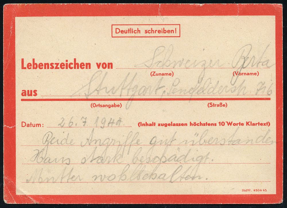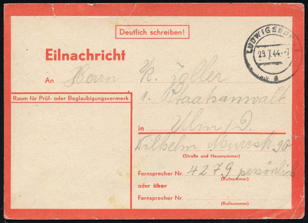 | 3021 | 30 € | LUFT- & BOMBENKRIEG / KINDER-EVAKUIERUNG (KLV) / FLAK-EINHEITEN (1939-45) : LUDWIGSBURG 1/ d 1944 (29.7.) 2K-Steg vorschriftswidrig auf roter Eil-Nachrichten-Kt. mit Druckvermerk: StdW 4304 43 (kl. Riß u. leichte Beförd.-Spuren) n. Ulm, = RAF-Bomber-Angriffe vom 24.-25.7. (ME.Nr.3) | | |