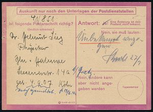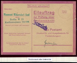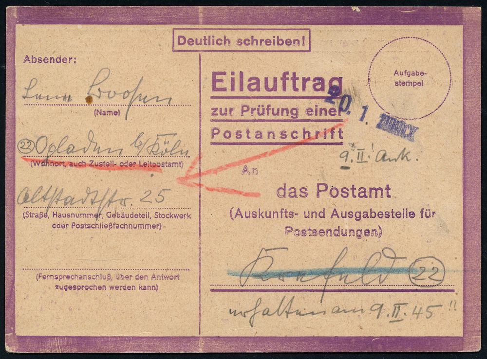 | 3028 | 40 € | LUFT- & BOMBENKRIEG / KINDER-EVAKUIERUNG (KLV) / FLAK-EINHEITEN (1939-45) : Opladen 1944 (20.1.) viol. Eilauftrag zur Postanschrift-Prüfung mit Druckvermerk: 5431 432 S (ME.Nr.1) + Datums-1 u. Dienstsiegel für eine Adresse in Krfeld in guter Erhaltung, selten! | | |