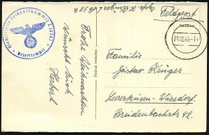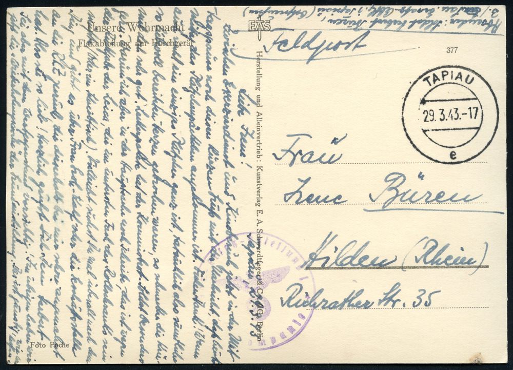 | 3031 | 14 € | LUFT- & BOMBENKRIEG / KINDER-EVAKUIERUNG (KLV) / FLAK-EINHEITEN (1939-45) : TAPIAU/ e 1943 (29.3.) 2K-Steg+ viol. 1K-HdN + hs. Abs.: Fp.-Nr. 2./ Sanitäts-Ers. Abt. in Tapiau auf s/w.-Foto-Ak.: Luftabwehr-Horchgerät, klar gest. Feldpost-Kt. n. Hilden/Rh. | | |