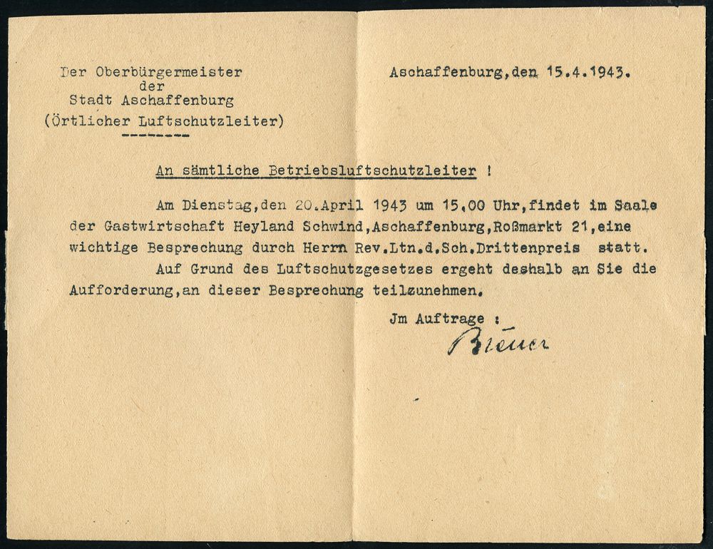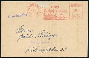 | 3004 | 20 € | LUFT- & BOMBENKRIEG / KINDER-EVAKUIERUNG (KLV) / FLAK-EINHEITEN (1939-45) : ASCHAFFENBURG 2/ Besucht/ Aschaffenburg/ die/ Spessartstadt 1944 (16.4.) AFS Francotyp "Reichsadler" = Schloß Johannisthal auf Dienst-Falt-Bf. mit Inhalt: "An sämtliche Betriebsluftschutzleiter!", betr. Besprechnung auf Grund des Luftschutzgesetzes (Dü.E-5CGo) | | |
