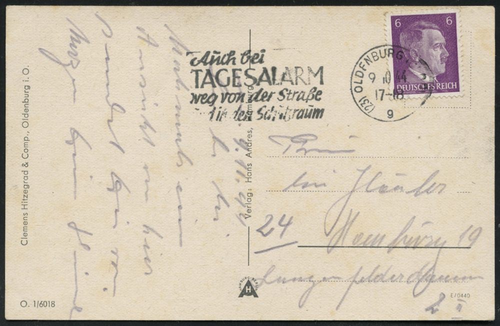 | 3027 | 20 € | LUFT- & BOMBENKRIEG / KINDER-EVAKUIERUNG (KLV) / FLAK-EINHEITEN (1939-45) : (23) OLDENBURG (OLDB)/ g/ Auch bei/ TAGESALARM/ weg von d.Straße/ u.in d.Schutzraum 1944 (93.10.) seltener Serien-MaWSt auf monochromer Foto-Ak.: Steingraben mit Hauptpostamt nach (24) Hambg. (Bo.S 421 A, nur 7 Monate verwendet!) | | |