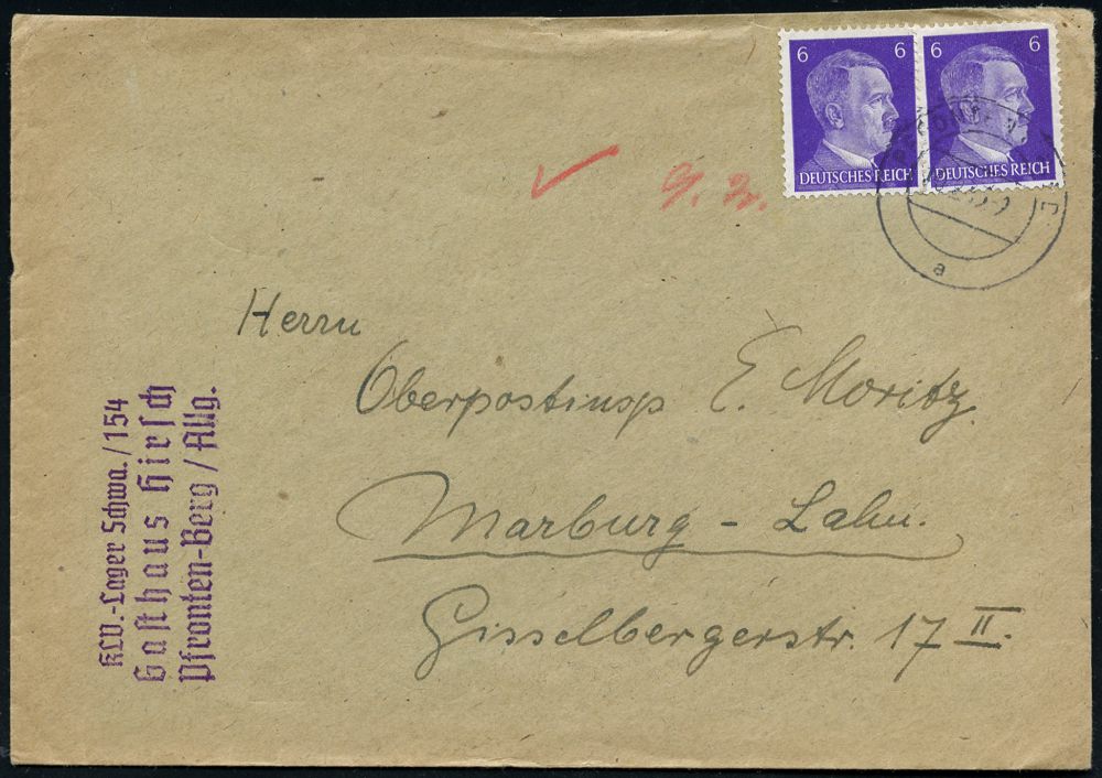 | 3029 | 18 € | LUFT- & BOMBENKRIEG / KINDER-EVAKUIERUNG (KLV) / FLAK-EINHEITEN (1939-45) : PFRONTEN-RIED/ a 1945 (10.2.) 2K-Steg + viol. 3L: K L V.- Lager Schwa.(ben) 154/ Gasthaus Hirsch/ Pfronten-Berg-Allg. , Fern-Bf. n. Marburg/Lahn (Mi.785 MeF) | | |