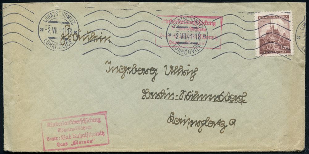 | 3047 | 20 € | LUFT- & BOMBENKRIEG / KINDER-EVAKUIERUNG (KLV) / FLAK-EINHEITEN (1939-45) : BÖHMEN & MÄHREN 1941 (2.7.) roter Ra.4: Kinderlandverschickung/Böhmen=Mähren/Lager: Bad Luhatschowitz/ "Haus Morava" 2x + Band-MaSt: LUHATSCHOWITZ/LUHACOVICE, sauber gest. Fernbf. + Inhalt ! n. Berlin-Wilmersdorf (Mi.29 EF) | | |
