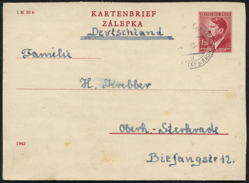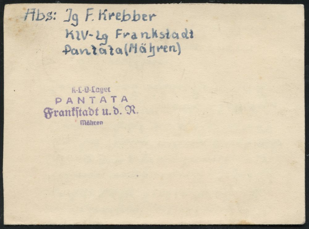 | 3048 | 25 € | LUFT- & BOMBENKRIEG / KINDER-EVAKUIERUNG (KLV) / FLAK-EINHEITEN (1939-45) : BÖHMEN & MÄHREN 1943 (25.10.) 1,20 Kc. Kartenbrief "Hitler", rot , rs. viol. Abs.-3L: K-L-V-Lager/ P A N T A T A / Frankstadt u. d. R./ Mähren + hs. Abs. rs., mit Inhalt eines Schülers n. Oberhausen-Sterkrade (Mi.K 4 II a, + 17,50 EUR) | | |