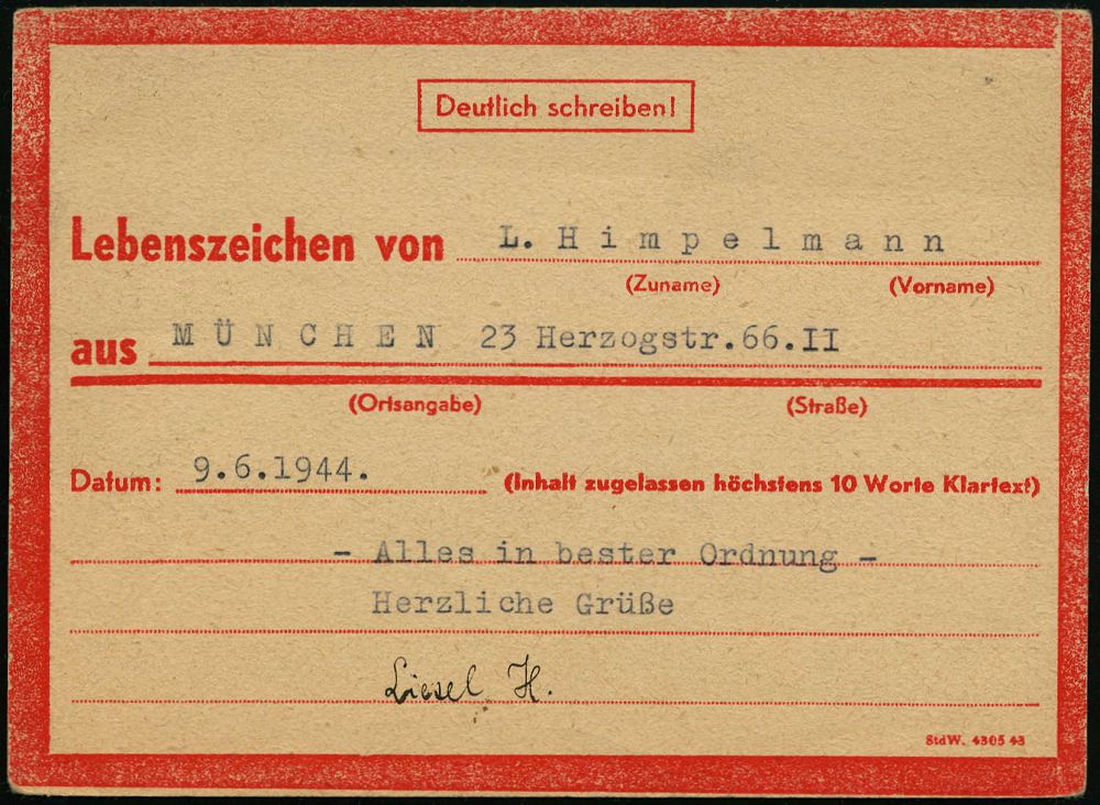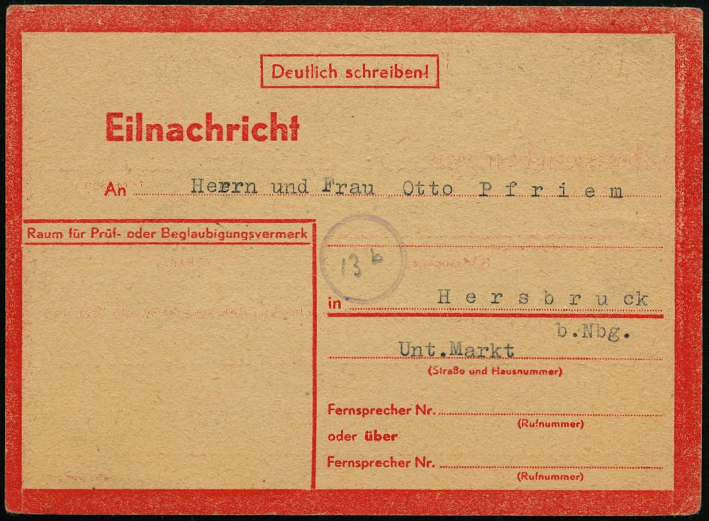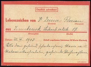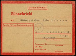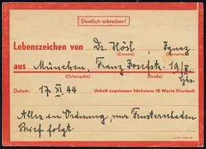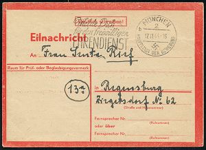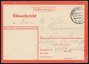 | 3024 | 20 € | LUFT- & BOMBENKRIEG / KINDER-EVAKUIERUNG (KLV) / FLAK-EINHEITEN (1939-45) : München 23 1944 (9.6.) portofreie, rote Eilnachricht-Kt. "Lebenszeichen", Text: "Alles in bester Ordnung.." , vorschriftsmäßig ungestempelt n. (13 b) Hersbruck (ME.3) | | |