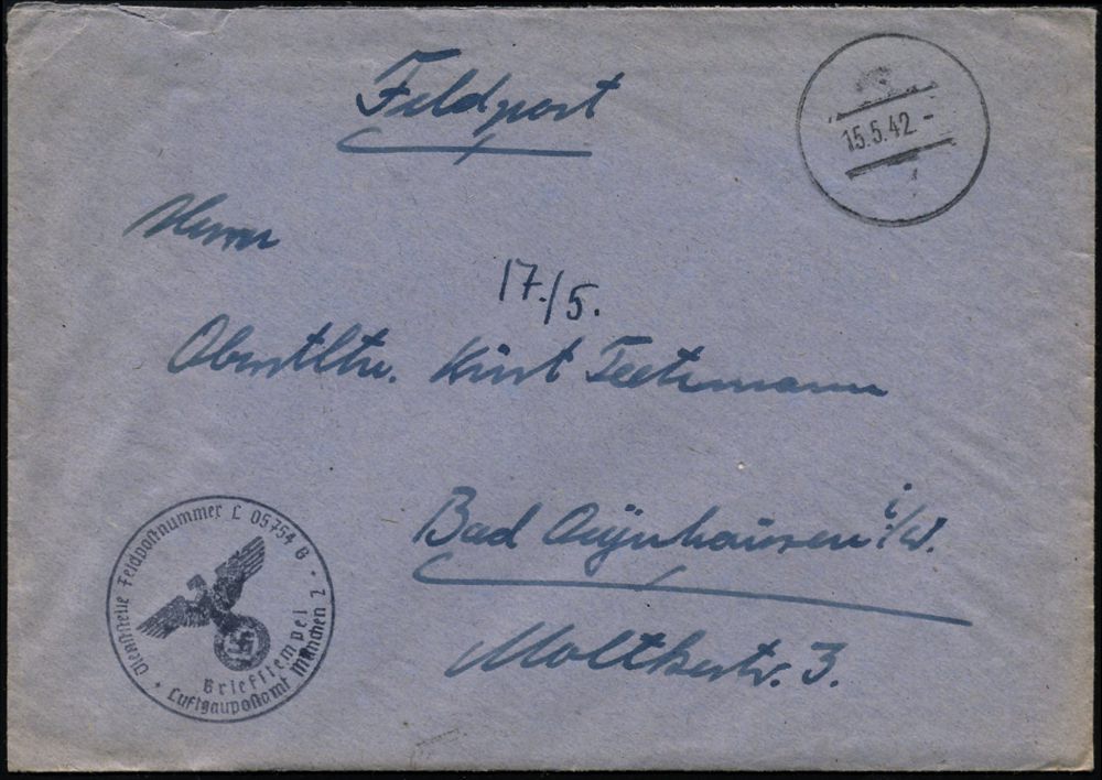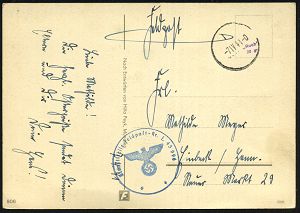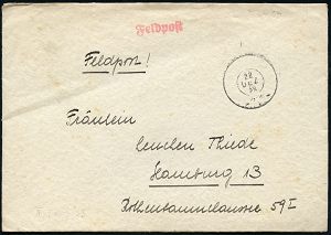 | 3023 | 18 € | LUFT- & BOMBENKRIEG / KINDER-EVAKUIERUNG (KLV) / FLAK-EINHEITEN (1939-45) : München 1942 (15.5.) stummer, aptierter HWSt = Tarnstempel München + schw. 1K-HdN: Fp.-Nr. L 05754 B/Luftgaupostamt München = Ergänzungsgruppe N a c h t j a g d - Geschwader 1, Feldpost-Bf. + Inhalt n. Bad Oeynhausen (Bo.73 aptiert) | | |