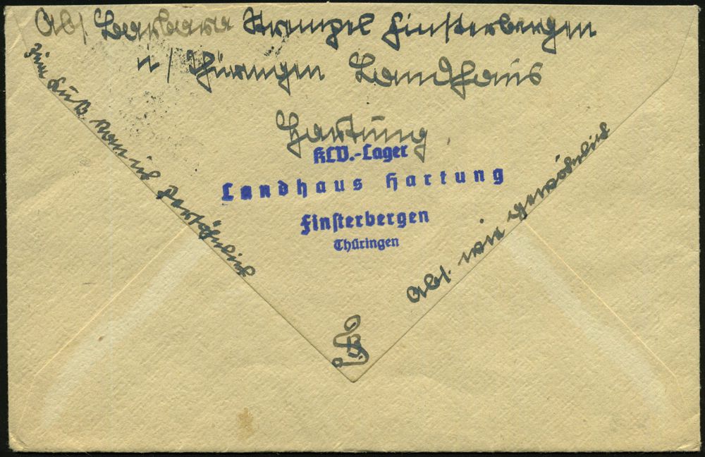| 3016 | 18 € | LUFT- & BOMBENKRIEG / KINDER-EVAKUIERUNG (KLV) / FLAK-EINHEITEN (1939-45) : FINSTERBERGEN/ (THÜRINGERW.) 1941 (12.4.) 1K-Brücke + rs. blauer 4L: K L V.-Lager/Landhaus Hartung/Finsterbergen.. , Fernbf. an (KLV-Lager ?) Bad Karlsbrunn, Ostsudetenl. (Mi.516 MeF) | | |