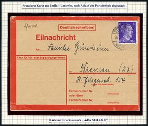 | 3007 | 35 € | LUFT- & BOMBENKRIEG / KINDER-EVAKUIERUNG (KLV) / FLAK-EINHEITEN (1939-45) : Berlin-Lankwitz 1944 (25.3.) 1K-Brücke: STRAUSSBERG/(OSTBAHN) auf frankierter Eilnachten-Kt. n a c h Ablauf der Porto-Freiheit = seltene Spätverwendung mit Frankaturzwang! (kl. Beförd.-Spuren) mit Druckvermerk: 5431 432 D (ME.1) n. Bremen (Mi.785) | | |