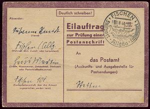 | 3017 | 40 € | LUFT- & BOMBENKRIEG / KINDER-EVAKUIERUNG (KLV) / FLAK-EINHEITEN (1939-45) : FISCHEN/ Skiort-Allgäu-Luftkurort 1944 (30.8.) HWSt auf viol. Eilauftrag zur Postanschriften-Prüfung mit Druckvermerk: StdW 4305 43 (ME.Nr.3) klar gest. in sehr guter Erhaltung n. Stettin | | |