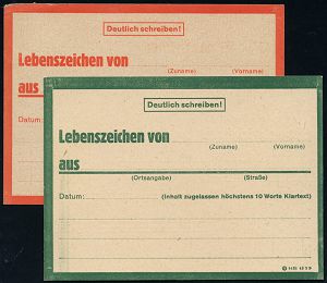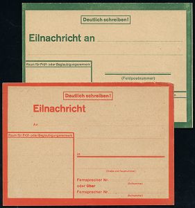 | 3041 | 18 € | LUFT- & BOMBENKRIEG / KINDER-EVAKUIERUNG (KLV) / FLAK-EINHEITEN (1939-45) : DEUTSCHES REICH 1943 rote u n d grüne "Eilnachricht"-Karte, je Druckvermerk: 541 43 2D ( je ME.Nr.1) je ungebr. (Einzelausruf möglich: je 12.- EUR) 2 Belege, | | |