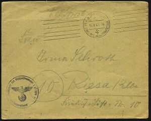 | 3043 | 10 € | LUFT- & BOMBENKRIEG / KINDER-EVAKUIERUNG (KLV) / FLAK-EINHEITEN (1939-45) : DEUTSCHES REICH 1943 (5.6.) stumme 1K-Brücke = Tarnstempel (Halle-Leuna ?) + schw.-viol. 1K-HdN: Feldpostnr. L 15323 = schwere Flak-Abt. 132 (LGPA Dresden), klar gest. Feldpost-Falt-Bf. mit Inhalt n. Essen | | |