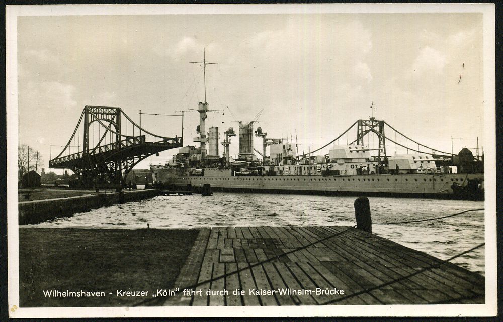 | 3056 | 12 € | DEUTSCHE KRIEGSMARINE 1933-1939 : Wilhelmshaven 1935 (ca.) s/w.-Foto-Ak.: Kreuzer "Köln" fährt durch die Kaiser-Wilhelm-Brücke (Schwenk-Brücke), ungebr. (Uhv. Nordseeverlag, W´haven) | | |